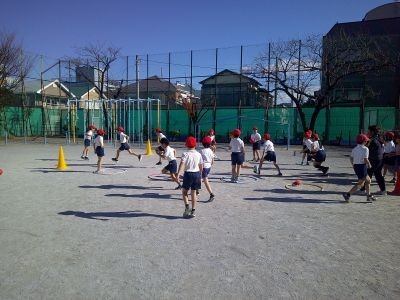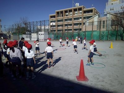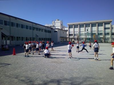 2年生の校庭での体育。両サイドに立つ子どもたちが、その間を走り抜けていく友だちに柔らかいボールをぶつけようとする。制限時間内に当てられることなく何回駆け抜けることができたか、というゲームをしていました。友だちと協力するなど工夫している子もいました。