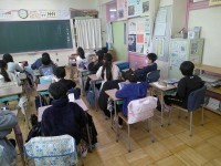5年生の外国語は友だちのことをより知ろうという課題。likeやcan、wantなどを使いながら、端末も活用して自分のことを伝えていきます。聞いた子は英語で質問をするなどしてコミュニケーションを図る練習をしていました。