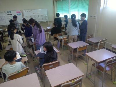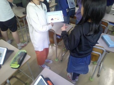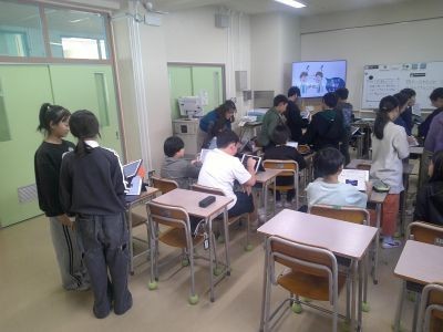 5年生の外国語は友だちのことをより知ろうという課題。likeやcan、wantなどを使いながら、端末も活用して自分のことを伝えていきます。聞いた子は英語で質問をするなどしてコミュニケーションを図る練習をしていました。