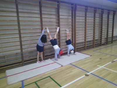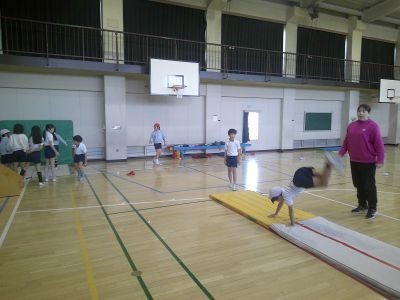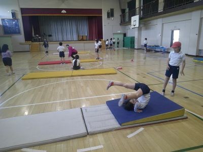 3年生の体育はマット運動。後転、倒立、側転など、自分で取り組んでみたい技を決め、その練習を中心に行っていました。友だちを補助したり、先生にポイントを尋ねたり。できる喜びを感じてほしいと思います。