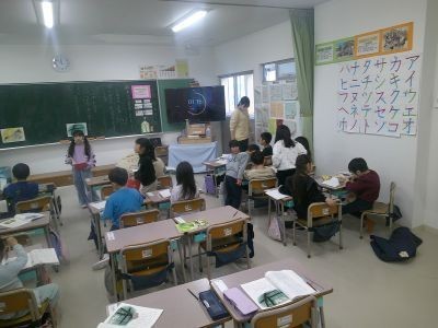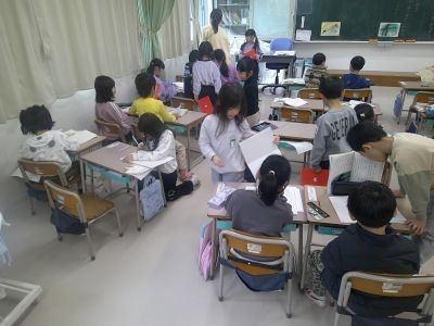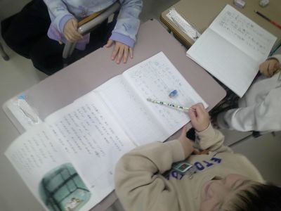1年生が国語で読んでいるのは「たぬきの糸車」というお話。「たぬきが上手な手つきで糸をつむぐことができたのはなぜか」ということについてそれぞれノートに考えを書き、みんなで話し合っていました。たぬきの様子がだんだん浮かび上がってきたようです。