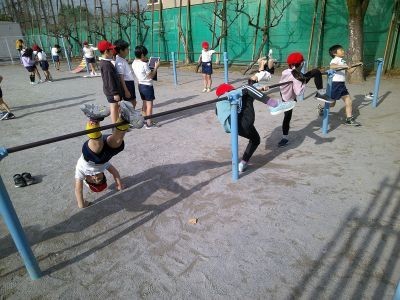 3年生が体育で鉄棒に取り組んでいました。鉄棒を握るとき、親指を鉄棒にしっかりかけて握ることが大切です。自分で目標にしている技を練習したり、友だちと動画を取り合ってコツをつかもうとしていたりする様子がみられました。