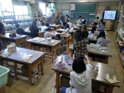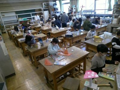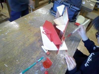 のこぎりで切った板を組み合わせて作品にしている4年生。できた形に熱心に色を付けている子などがいました。自分の作品に愛着を感じているのかなと思えるような姿。自分への自信になっていくといいなと思います。
