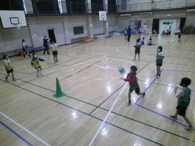 3年生が体育でプレルボールに取り組み始めていました。ネットをはさみ、自分たちのコートにワンバウンドさせてパスしたり、相手に投げ返したりして得点をとったりするゲーム。基本的な動き、ルールを教わり、少しゲームにもチャレンジしていました。
