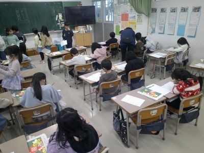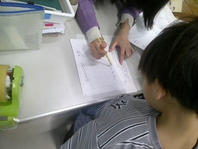 1年生の初めての書初めは硬筆。その練習をしている学級がありました。一文字一文字ていねいに書いて、担任に見てもらいアドバイスを受け、さらに練習。1月の本番が楽しみです。