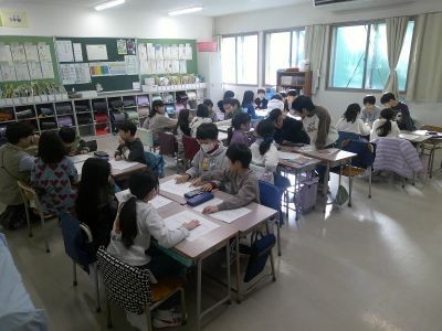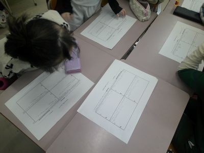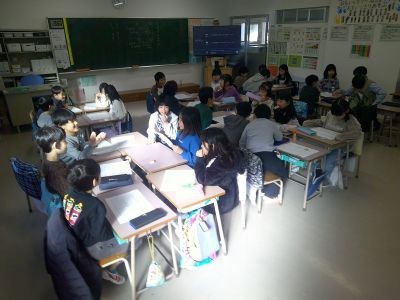 2年生の教室でグループになって冬休みの振り返りをしていました。おばあちゃんの家に行った、お年玉をもらった、初詣に行った、雪かきをした・・・。1人4つを挙げ、一つは架空の出来事。それを当てるというクイズ形式で盛り上がっていました。