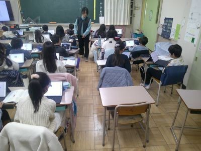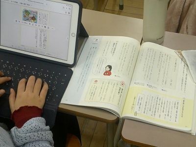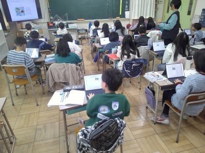3年生の国語の学習は物語づくり。教科書に出ている「たから島のぼうけん」という話をもとに、どんな人物が出てくるか、どんなことが起きるかなどを考え、メモをして作品にしようとしていました。表現の仕方を工夫しようとがんばっている子もいました。