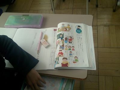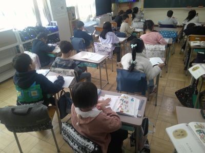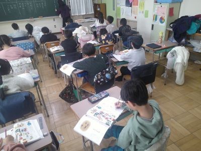 算数、画用紙、考える・・・。3年生の3学期になってくると、教室の中で使うもの、学習にかかわる言葉などを漢字で書くことができるようになってきます。そうした習った漢字を使って文章を作るという活動を国語で進めていました。