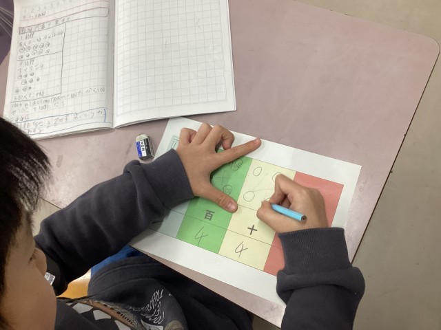 2年生の算数の学習です。たくさん並んだお金のシール。100のまとまりを、位取り表の百の位に入れたいけど、23個も入らない・・・1000を超えてしまいそうだね・・・という問題です。「10のまとまりが10個で100だから、、、」「100のまとまり10個で、1000に両替すればいいんじゃない?」1年生、2年生1学期の学習を思い出して取り組んでいました。