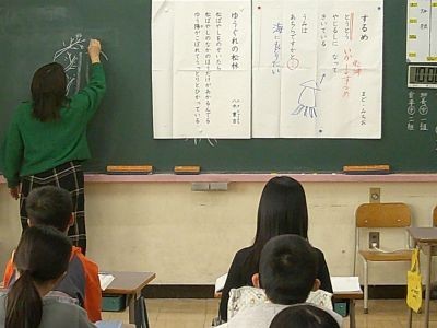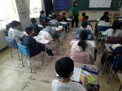 「ゆう陽がこぼれてうっとりとひかっている」。5年生が国語で学習していた「ゆうぐれの松林」という詩の一節です。どのような情景を表現しているのかを想像していました。「ゆう陽」「こぼれて」「うっとり」などから、一人一人のイメージを広げていました。