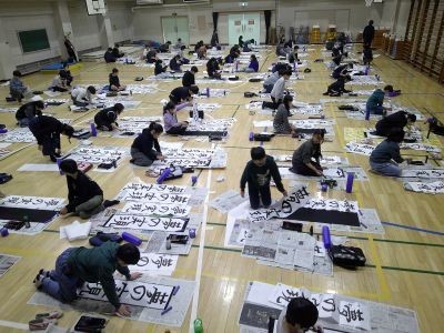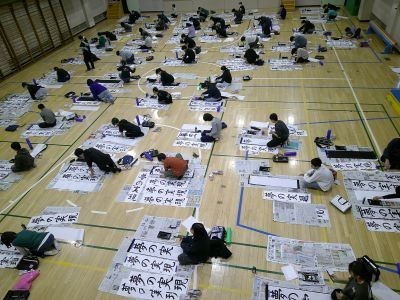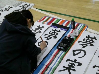 6年生の書き初めは「夢の実現」。体育館での活動を、地域の書道の先生も来校し参観されました。「みんな集中して取り組んでいる様子にとても感心しました」との感想をいただきました。