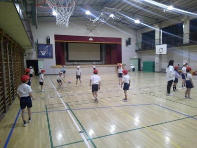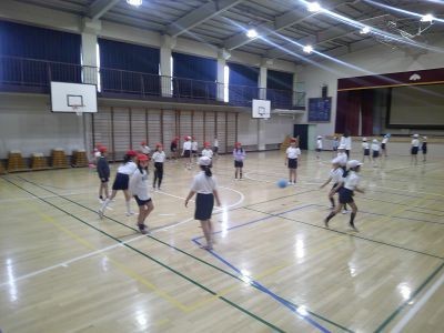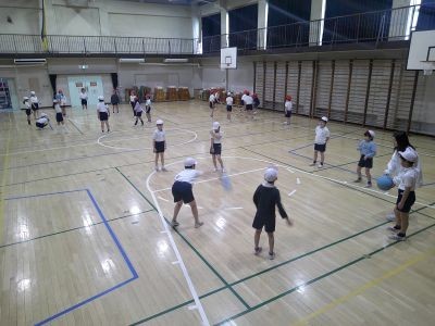 体育でプレルボールに取り組んでいる3年生。ボールを床に1階バウンドさせてパスをするという基本の運動を練習していました。普通にパスするときとは違って、ちょっと工夫が必要です。相手が取りやすいように工夫するなどしていました。