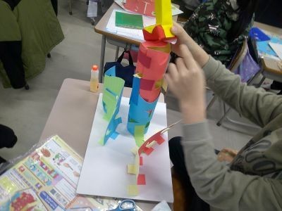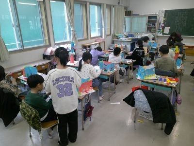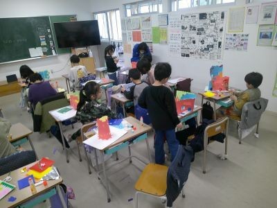 画用紙にカッターで切り込みを入れるなどして窓をつけ、その紙を立ち上げるようにして家を作る・・・2年生の図工です。立ち上げてみて、さらに工夫を加えて、と子どもたちは自分の作品づくりを楽しんでいました。