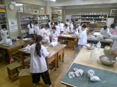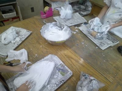 4年生が図工で液体粘土を使った作品作りに取り組んでいました。ボールの中に白い粘土が入っていて、それを手でこねるようにしていきます。その感触を味わいながら、自分が表現したいものを形にしていこうと活動していました。