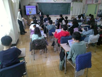 ICT支援員の説明を受けながら、プログラミングについて学習している5年生の学級がありました。どういう指示をすればどのような変化が起きるのか、プログラミングによってどのようなことが可能になるのかなど、実践しながら学んでいました。