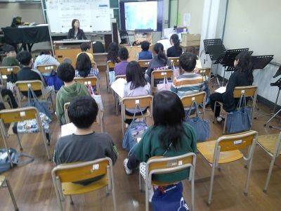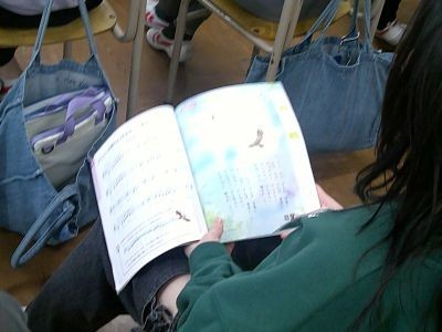 4年生が音楽で歌う練習を始めていたのは「とんび」。「とべ とべ とんび 空高く」「楽しげに 輪をかいて」などの歌詞からイメージしたり、実際にとんびが飛ぶ様子の画像を見たりして、どんな声で、どんなふうに歌うか考えていました。