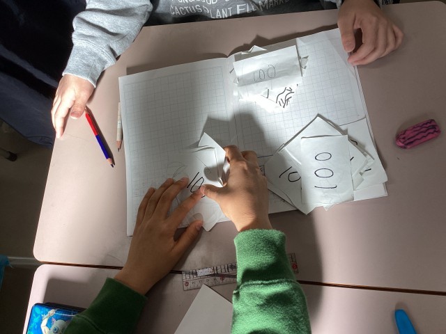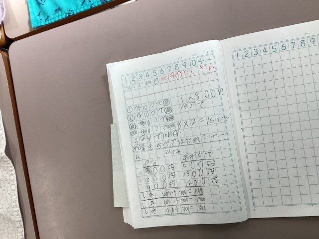 2年生の算数の学習です。700+500の計算の仕方を考えた後、ゲームをしました。じゃんけんで勝ったら100円もらう。負けたら100円払う。2人の合計金額を合わせて、クラスで1番のお金持ちペアを決めました。遊ぶ中で、自然と900+400、600+800と、まとまりを意識して計算していました。手持ち500円からスタートし、3900円まで集めたペアが優勝しました。