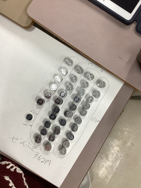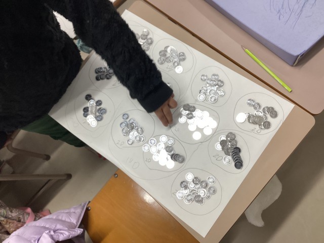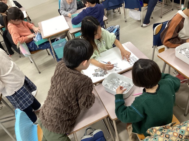 3人グループになって、たくさんつかんだ1円玉を数えました。どの班が1番多く掴めたかな?という2年生の算数の学習です。今まで学習したことをもとに、「まとまる」を考えて数えました。10ずつ、20ずつ、50ずつにした後、「100のまとまりにした方が数えやすいよ。」という声が挙がりました。実際に数えてみてどうだったか尋ねてみると、「300枚くらいでこんなに時間がかかると思わなかった。」「1000枚だと1時間かかっちゃうな」「クラス全員の数を合わせると、1000のまとまりにした方が良さそう」「昨日勉強した10000枚、数えてみたい!」実際に手を使って数えることで、いろいろな学びがあったそうです。