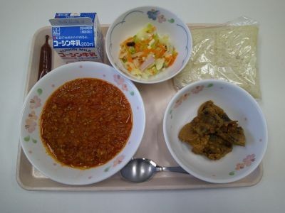 献立は、ソフト麺、ミートソース、クジラの竜田揚げ、フレンチサラダ、牛乳、ミルメークでした。