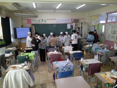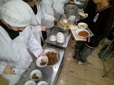 写真は5年3組の給食風景。今日は昭和の給食です。配られたミルメークが何なのか、どうするのか、不思議がっている子もいました。