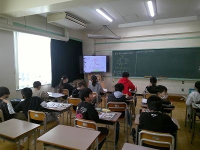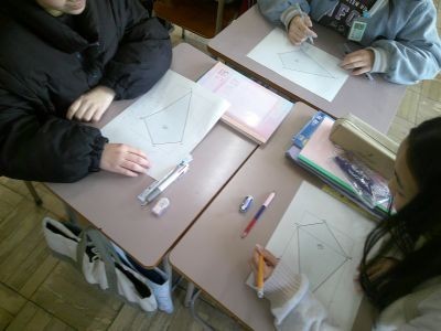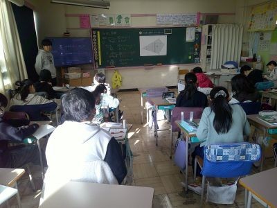 5年生が算数で四角形の面積を求める問題に取り組んでいました。平行四辺形や台形など公式を使って求められる形から、いくつかに分けて考えなければならないような問題まで。友だちと協力しながらがんばっている子もいました。