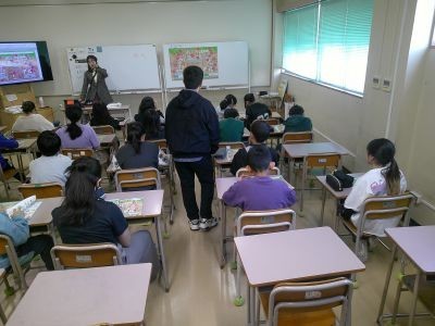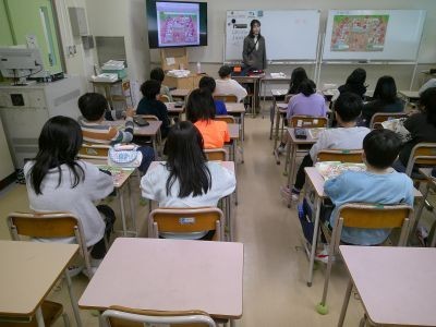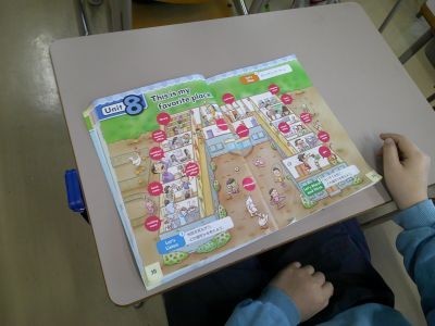 4年生の外国語活動。学校のさまざまな部屋、教室などの英語での言い方を学習していました。「gym?」「体育館じゃないかな」「library?」「図書室?」など、英語で言われると何となくこれかなという声が聞かれました。逆は難しそうです。