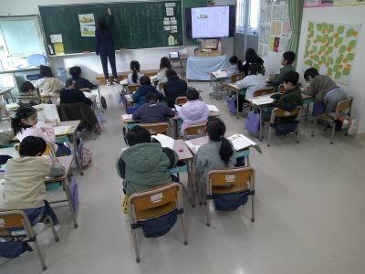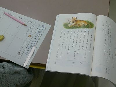 1年生が国語で「どうぶつの赤ちゃん」という話を読んでいました。生まれたばかりのときはどんな様子をしているでしょう、などの問いの文章と、その答えの部分に注目しながら読み進めていました。