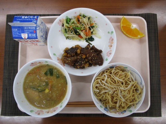 献立は、みそラーメン、レバーとポテトの中華揚げ、海藻サラダ、しらぬい、牛乳です。本日は、学校給食試食会を行いました。申し込んでいただいた保護者の皆様に人気ナンバーワンメニューのみそラーメンを召し上がっていただきました。大好評でした。