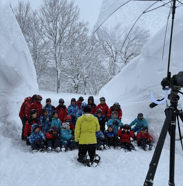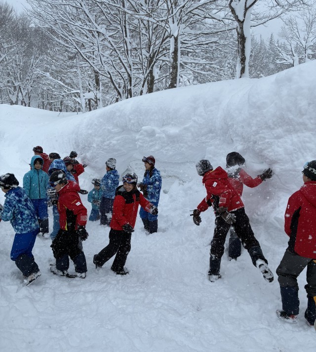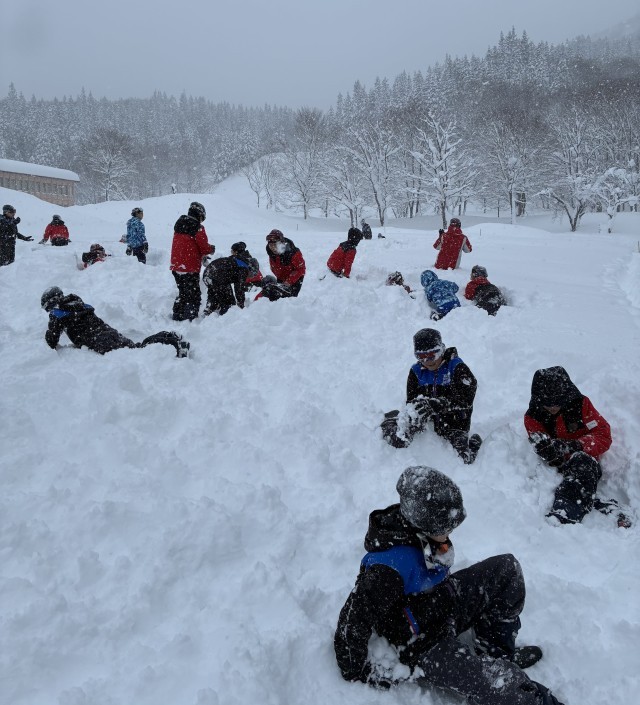ウェアを着て雪遊びです。ものすごい雪の量にみんな大興奮。記念撮影後、一気に雪まみれになりました。