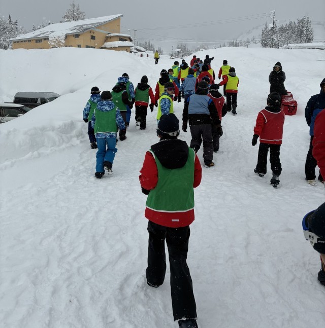 スキー場に到着しました。ゲレンデの下でまずは記念撮影です。バスで移動中、少し日がさす時間もありました。少しは晴れてくれるといいなと思います。