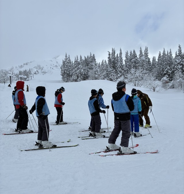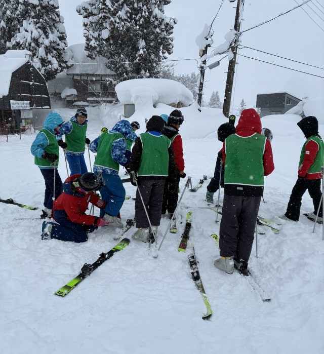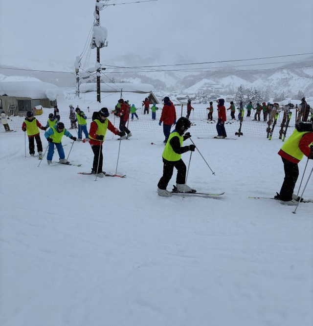 片足にだけスキー板をつけ、まずは歩く練習。右、左、そして両足。次に両足でカニのように歩いて斜面を上る……。グループごとに練習が進み始めました。今の雪は小降りで助かってます。