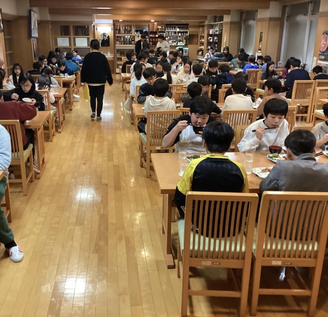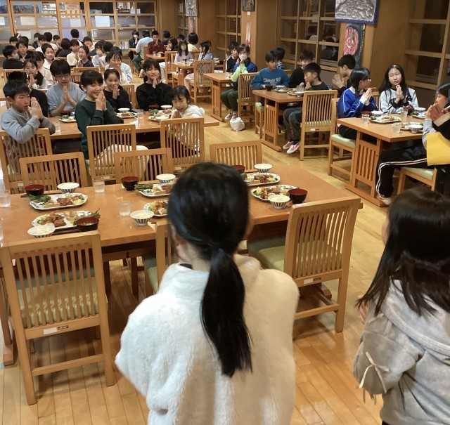 夕食です。たくさん運動したので、お腹ペコペコの子もたくさんいました。友だちとの話も盛り上がっていました。
