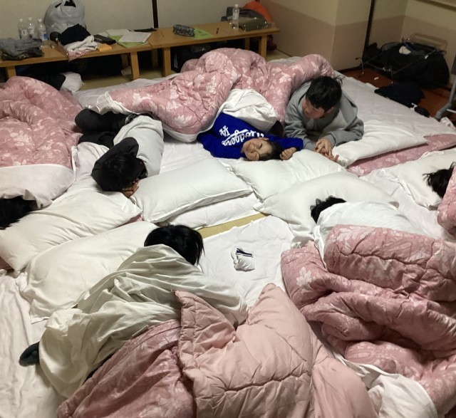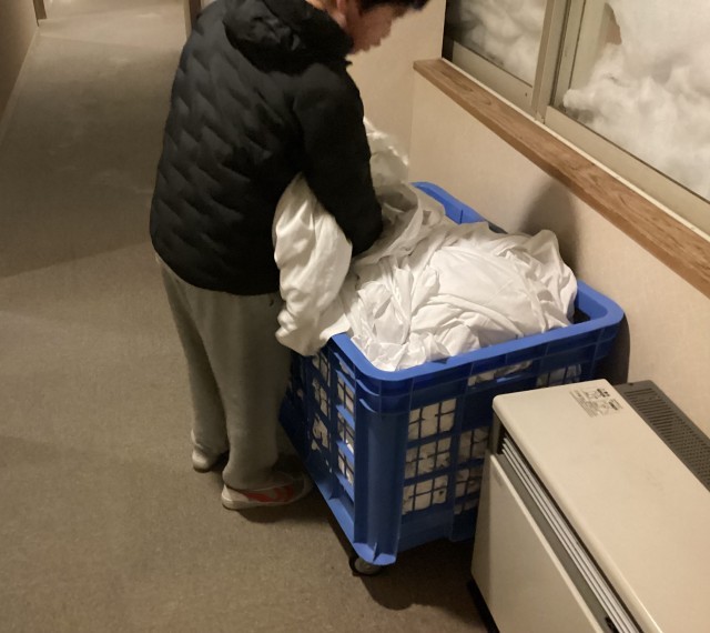 おはようございます。3日目の朝を迎えました。朝までみんなよく寝ていたようです。起きたら身支度。シーツや枕カバーは洗濯しやすいように、あえて丸めて集めています。