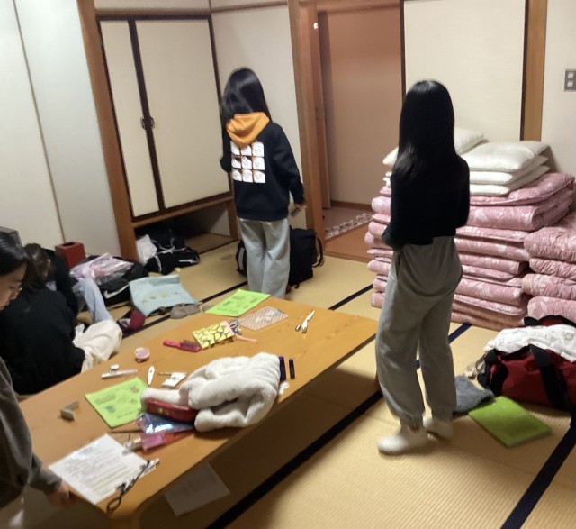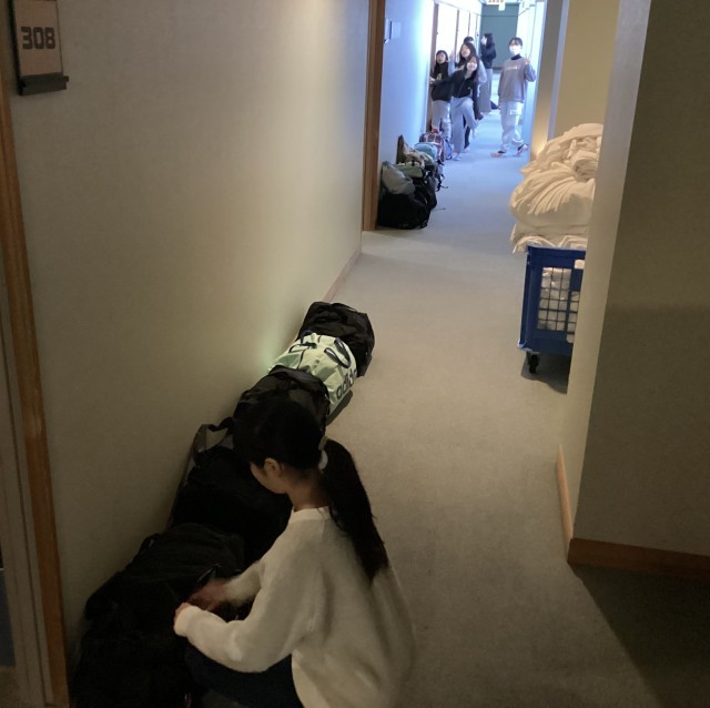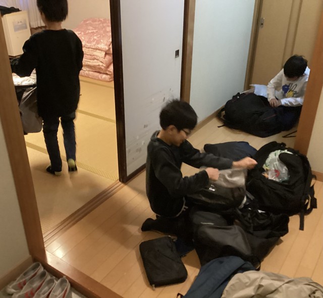部屋の片付けをしています。支度ができたら荷物は外へ。廊下に次々並び始めました。みんな手際がいいです。