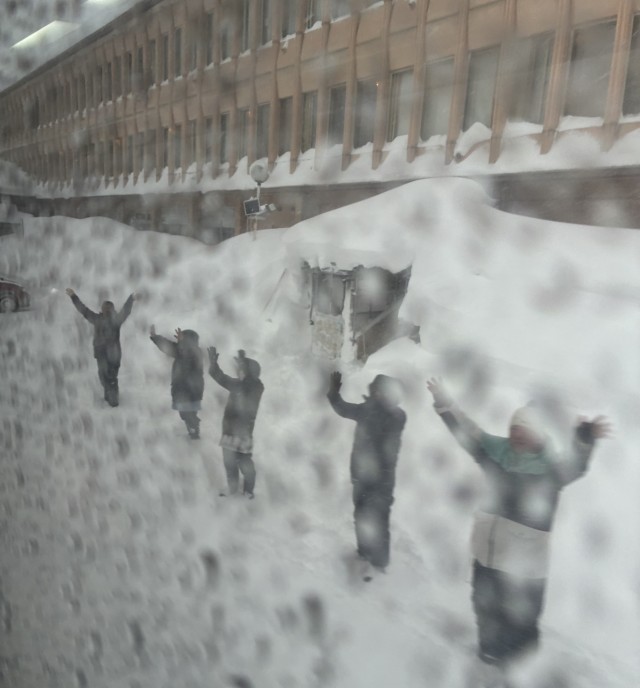9時前、予定より早く浅草山荘を出発しました。吹雪く中、施設の皆さん、関係の方がお見送りしてくださいました。