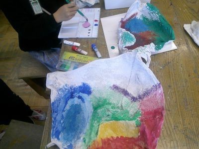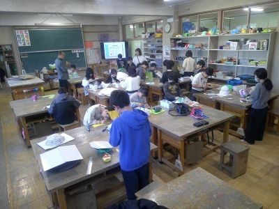 4年生の図工。前の時間に固めた布の形をよく見て、何に見えるか想像を膨らませ、色を付けるなどして作品にしていました。火山、ものを置く入れ物、宇宙・・・子どもたちの発想はさまざまです。