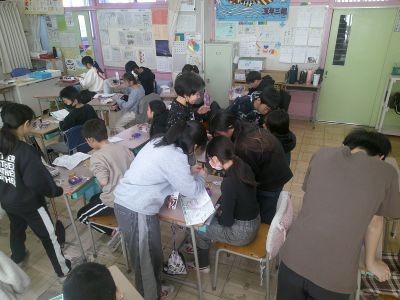 5年生が理科で電磁石を使った学習をしていました。コイルを巻いた鉄心に電流を流すと置いていた釘が吸い付けられていきます。電流の向きと極の関係や電流の大きさ、巻数と電磁石の強さなどについて学んでいきます。