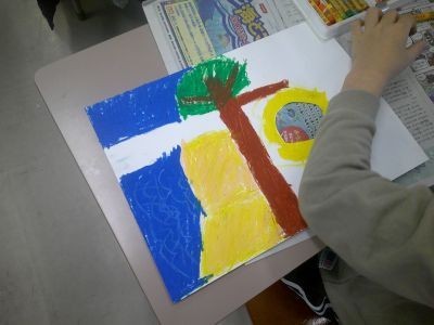 画用紙に穴を開け、もう一枚画用紙を重ねてそこにも同じように穴を開け、それぞれに絵を描き、穴を重ねるようにして2枚を張り合わせます。たとえば、海と公園など2つの世界が穴でつながっていました。2年生の図工です。