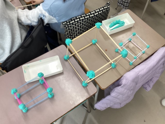 2年生の算数の学習です。今日の箱はいつもと違いました。子どもたちは「骨しかない箱」と表現していました。作る前に、作戦を立てました。「ねんど玉は何こ必要かな。」「骨は10本くらいかな、もっとかな。。。」「10本じゃ足りなそうだな」作りながら「ねんど玉には〇本骨が刺さってるな」「こことここの骨の長さが同じだ」いろいろなことに気づいていました。