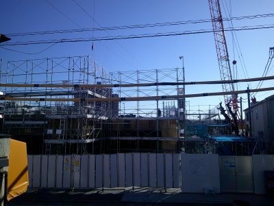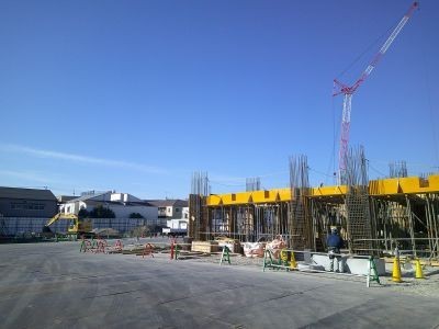 今日の校舎改築現場の様子です。1階と2階の境目にあたるところあたりに黄色い鉄骨が見えています。大きなクレーンを使いながら、建物の骨組み部分の工事が続いています。