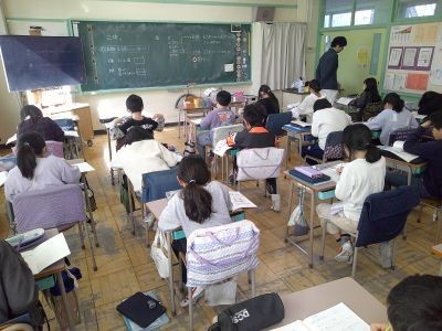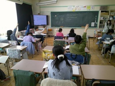 4年生が算数で図形について学習していました。面に注目し、正方形だけでできた立方体。正方形と長方形でできた直方体などのわけ方をしていました。形によって辺の長さや数、頂点の数などを整理するなどしていました。