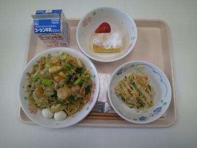 献立は、海鮮あんかけ焼きそば、切り干し大根の中華サラダ、ぐりとぐらのカステラ、いちご、牛乳でした。