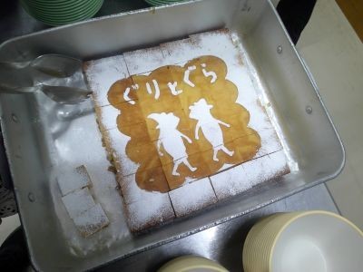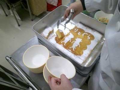 読書週間にちなんだ献立です。教室でカステラの食缶を開けると、ぐりとぐらの世界がカステラの上に描かれていました。「あ~こわれちゃう」というつぶやきが聞かれる中、配られていました。