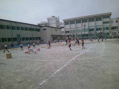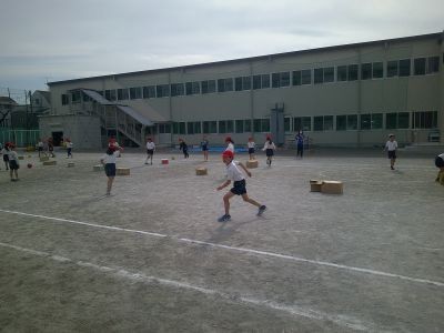 2年生の校庭での体育はボールを蹴る活動。段ボールを中央に置き、それをめがけてボールを蹴ります。力いっぱい蹴る子、目標に当てることを優先して加減する子。思い思いに取り組んでいました。