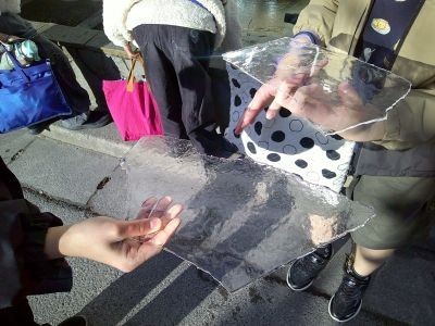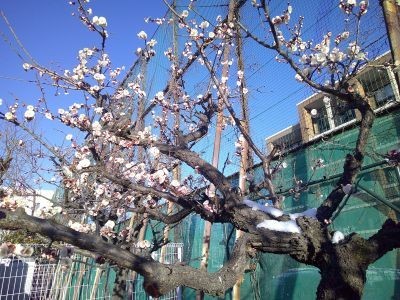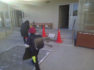 昨日の雪が花を付けている梅の枝にも残る中、子どもたちが登校してきました。プールをはじめ水が溜まっているところには氷が張り、それを手にしていた子もいました。子どもたちの昇降口の階段も凍っているところがあったため、水で溶かして迎え入れるようにしました。