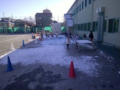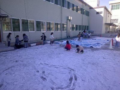 校庭の仮設校舎近くは日中も日かげになっているため雪が降ると溶けるのが遅くなります。多くの子どもたちにとって雪は楽しいもの。1年生が雪を触ったり丸めたりしながら遊んでいました。昇降口近くには、作ったものがかわいく置かれていました。