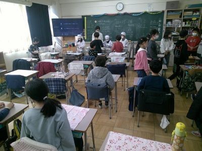写真は3年3組の給食準備風景。食品ロスを減らすことへの意識を高める料理が順に配られていました。