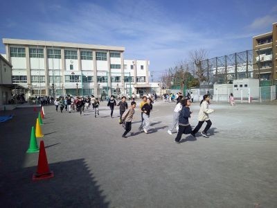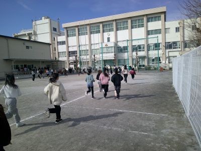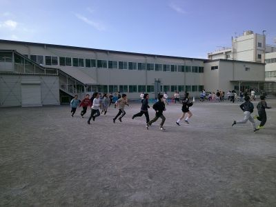 持久走週間が続いています。今日の中休みはまず5年生。3人の担任も一緒にみんな力強く走り出していました。それぞれのペースでの3分間でした。