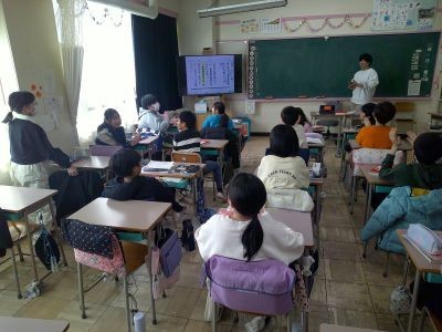 学校へ来た方に体育館の場所を尋ねられ「体育館はあっち。案内するよ。よかったら、このスリッパ使って。」と答えたが、どう直せばいいかという課題。5年生の国語、敬語の学習です。大人でも難しいことがありますが、みんなでこうしたらいいのでは、と話し合っていました。