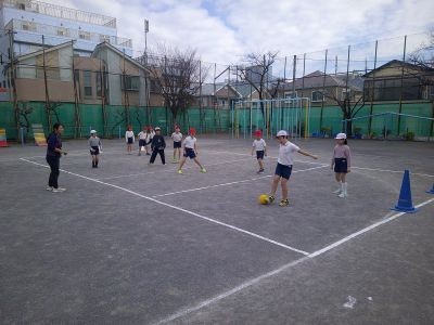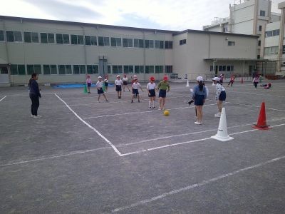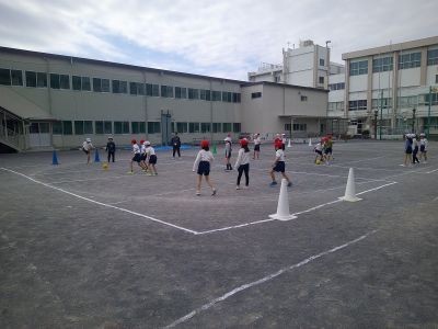 2年生の校庭での体育。赤白のチームに分かれてボールを蹴って点を取り合うゲームをしていました。攻める子、守る子などに分かれて簡易なルールで行い、みんなでかかわれるよう進め方を見直すなどしていました。